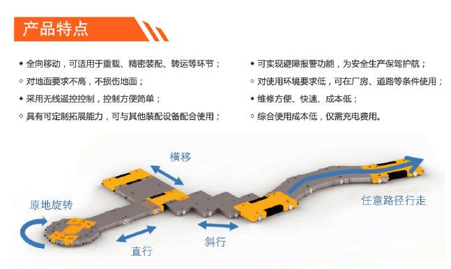 全向輪AGV采用麥克納姆輪機(jī)構(gòu)進(jìn)行定制組合,麥克納姆輪是一種可二維平面無(wú)死角任意漂移的高精度移動(dòng)輪組形式,通過(guò)單獨(dú)控制輪子的轉(zhuǎn)速、轉(zhuǎn)向?qū)崿F(xiàn)車(chē)的直行、橫行、斜行、原地旋轉(zhuǎn)、各種連續(xù)曲線的移動(dòng)。運(yùn)動(dòng)靈活、平穩(wěn),通過(guò)位置細(xì)微調(diào)整實(shí)現(xiàn)精準(zhǔn)定位和高精度軌跡控制。作為平面高精度移動(dòng)設(shè)備運(yùn)用于航空航天、船舶、軌道交通、工程機(jī)械、倉(cāng)儲(chǔ)物流、電力電氣、國(guó)防科工、科研教學(xué)等等眾多領(lǐng)域。
