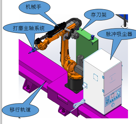 鉆桿焊縫打磨系統(tǒng)主要由變位機裝置,機器人打磨裝置,換刀機構,安全防護,控制系統(tǒng)等幾部分組成。配有視覺檢測系統(tǒng),打磨過程在線跟蹤檢測。實現(xiàn)在線監(jiān)控打磨,提高打磨質量。